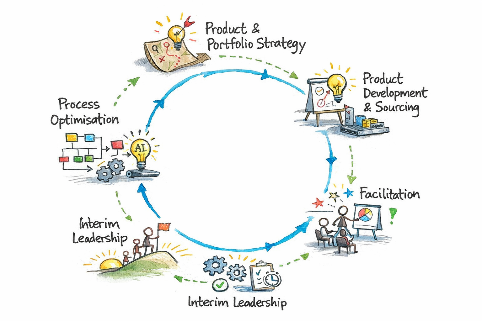 I am not a pure advisor — I step in when clarity, structure and momentum are required. From portfolio architecture to process optimisation and interim leadership, I translate strategy into measurable results.